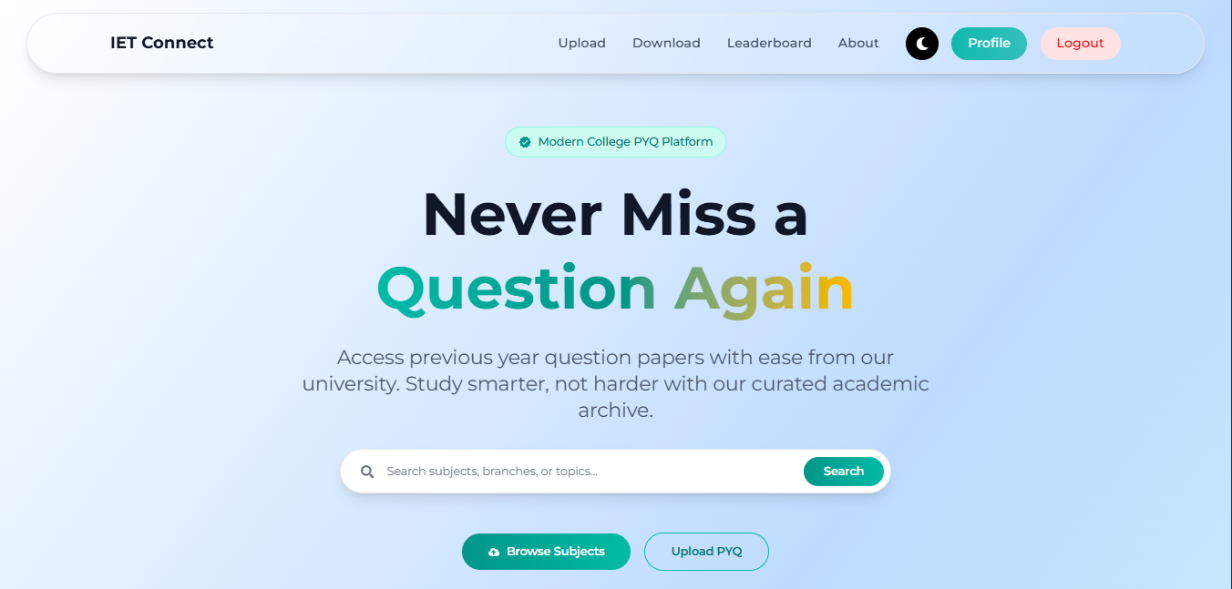 Web platform for students to upload and access previous-year question papers, creating a centralized academic resource hub.